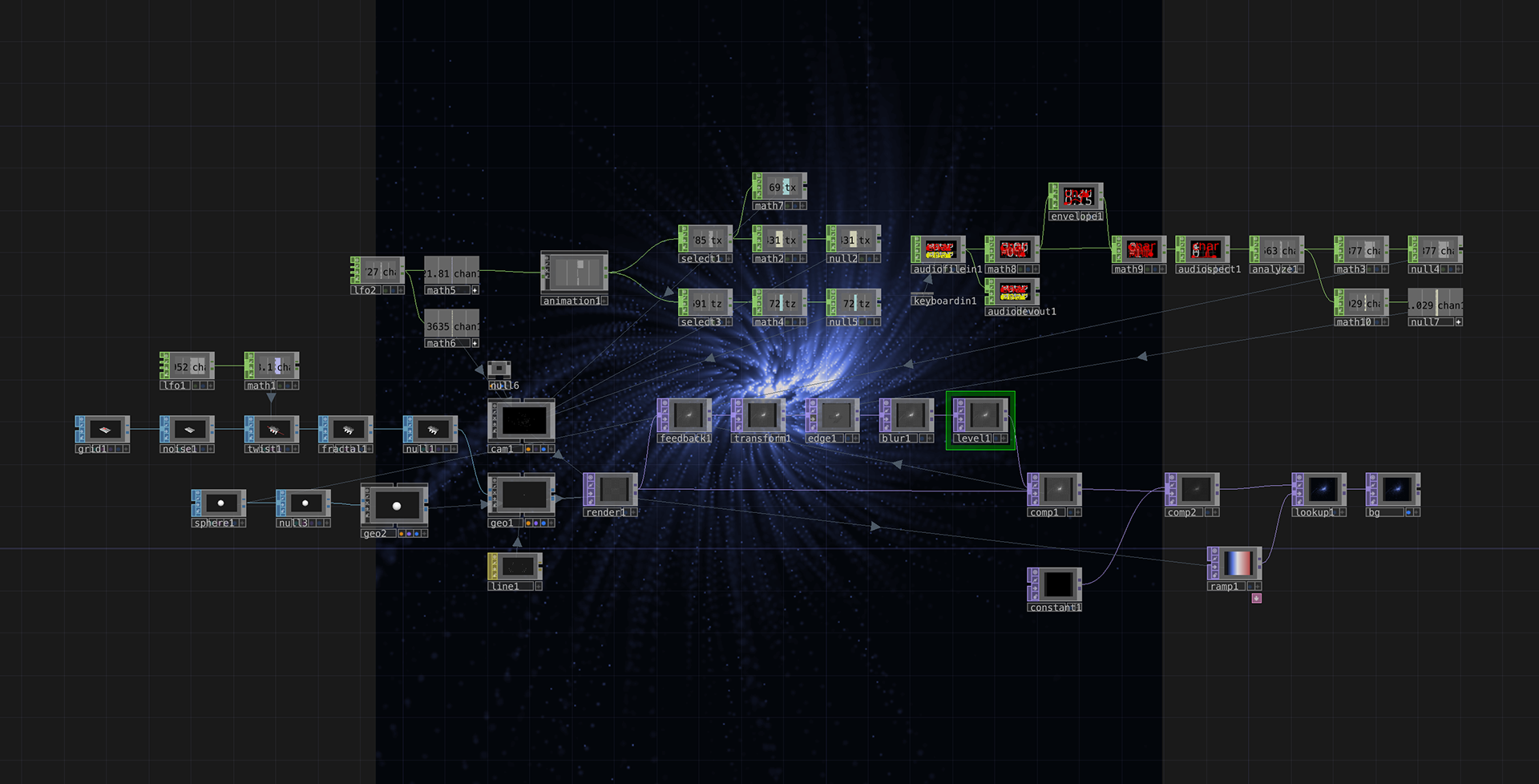 To achieve that deep-space aesthetic, I relied on a rich post-processing network. I combined a feedback loop with edge detection and blurs to generate the sweeping, luminous trails that flow through the dark canvas. Finally, I used a custom lookup ramp to color the scene in deep, tranquil blues and bright starlight whites, perfectly capturing the feeling of a celestial birth.