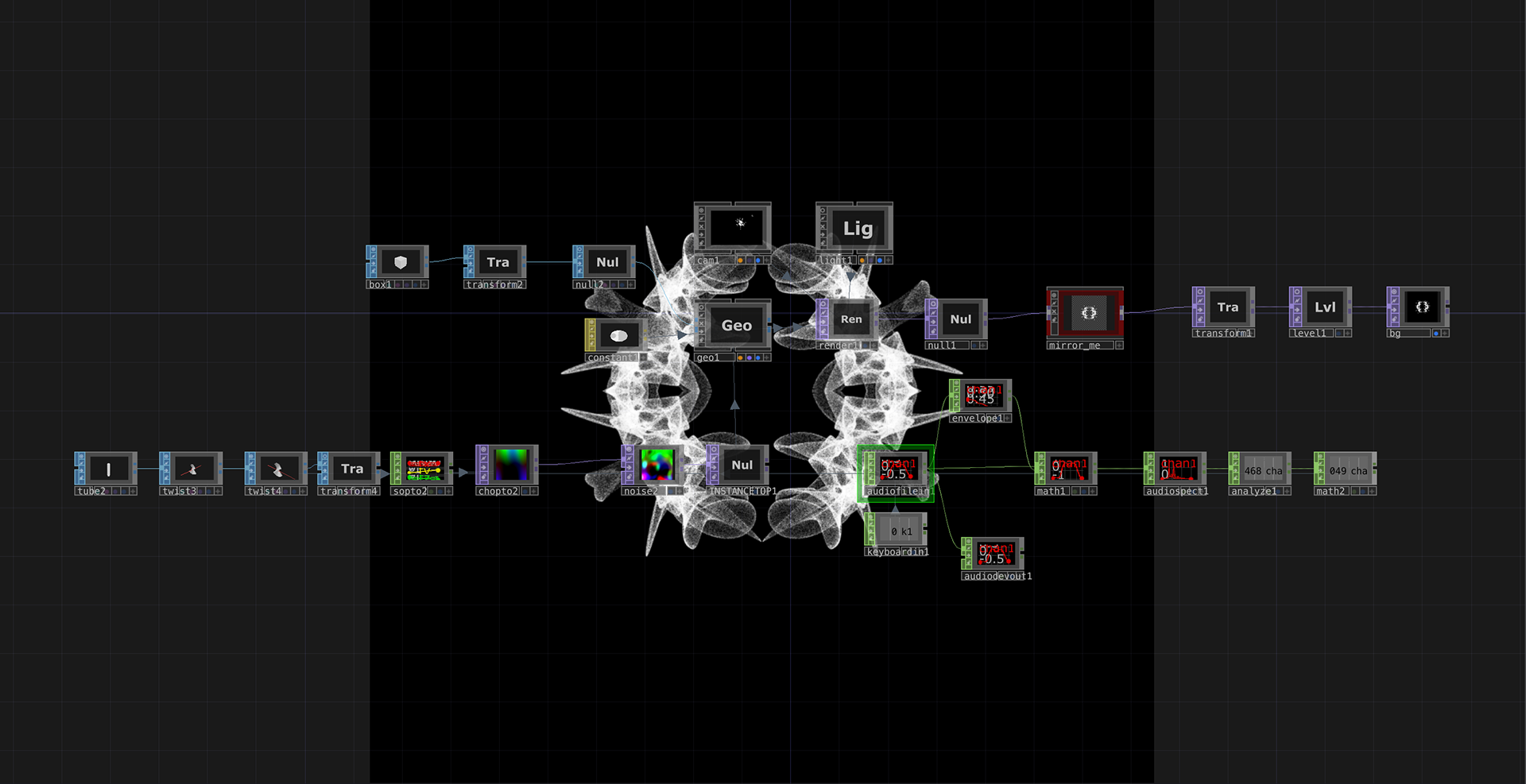 I aimed to transform invisible sound waves into visible, organic forms. The foundation of the work relies on audio-reactive geometry manipulation and instancing techniques.