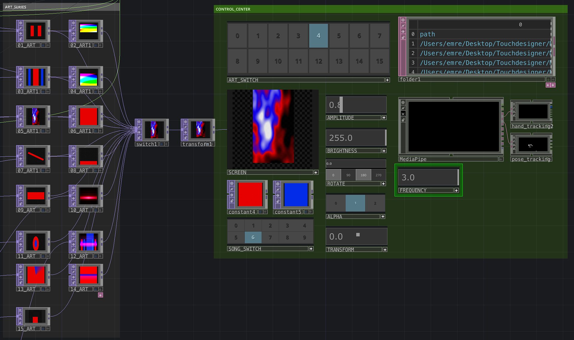 A key feature of this network is the custom logic and switching system I built, which you can see in the 'ART_SWITCH' section. This allows the sculpture to fluidly transition between different visual states and color palettes—shifting from tranquil cyan and orange flows to intense, aggressive red bursts. Finally, this 2D pixel data is mapped and routed out to the physical LED strips, turning the installation into a living entity where the central pillar stands strong, anchoring the surrounding storm of light.