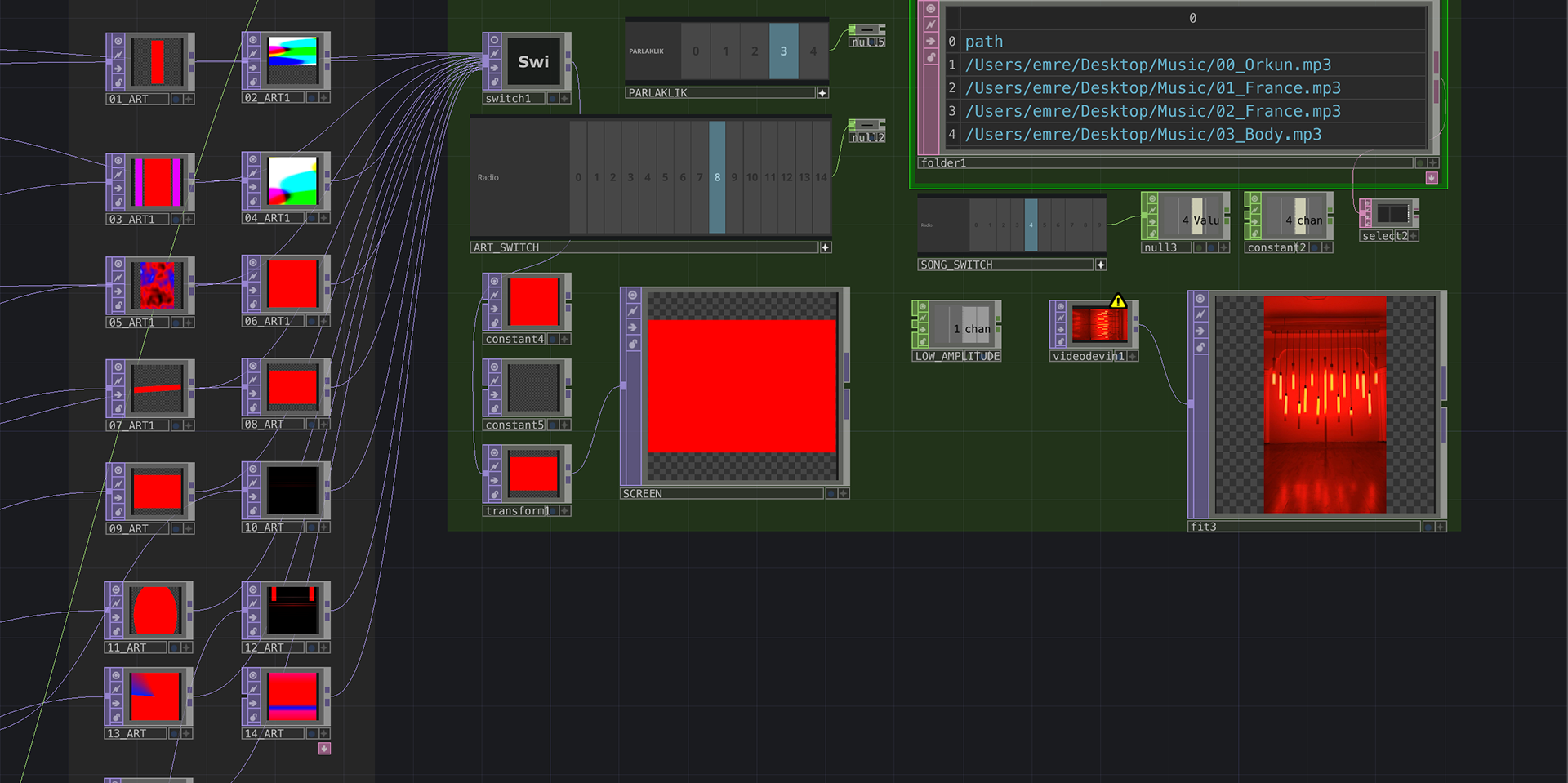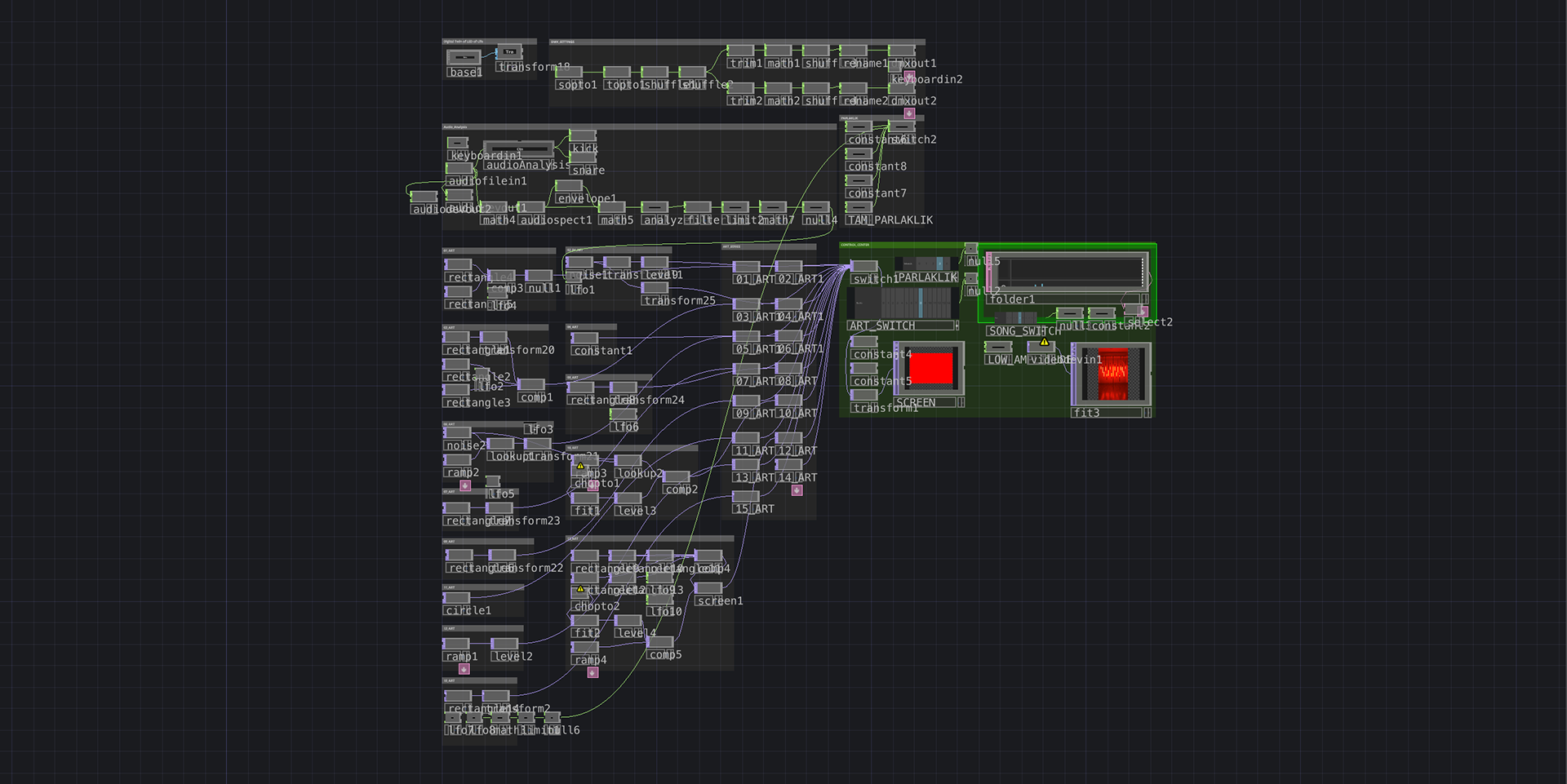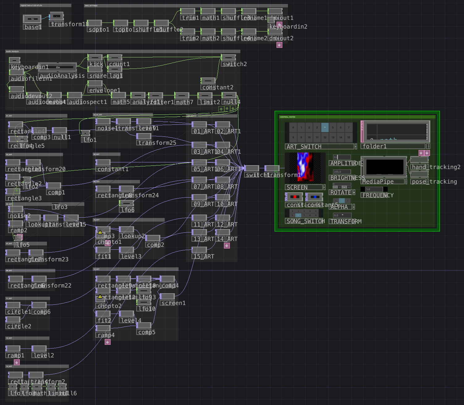 The workflow begins with a comprehensive audio analysis setup that extracts the rhythm and dynamic frequencies from the environment or a track. Instead of 3D geometry, this network relies heavily on a 2D TOP (Texture Operator) system. I generated various visual patterns using rectangles, noise, and color ramps. These patterns are continuously animated and warped by the incoming audio data.